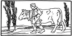 He arrived home in a bad mood and decided he would buy another cow. This he did and he slaughtered it himself, thinking that if he could get a good price for the meat he would make as much as the two cows had been worth and would have the cow's hide too. The peasant took the meat to town where he was met at the town gate by a pack of dogs led by a large greyhound, who belonged to the town's butcher. The greyhound came sniffing to the meat and barked "Bow wow, what now?" The peasant said to the dog, "I understand that you want the meat but I cannot give it to you for free. If you will be responsible for your fellows I will leave the meat with you for I know your master. But mind, you must bring me the money for the meat in three days." "Bow wow, what now?" said the dog. Satisfied with the deal the peasant left.[1][2]