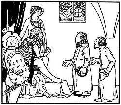On being told of the peasant's disrespect the king angrily demanded that he be brought before him. The Jew went straight to the peasant to tell him he must go at once to the king just as he was. The peasant said, "It is not right that someone like me with so much gold in his pockets should appear before the king shabbily dressed. Lend me a nice coat so I can make a fitting appearance." Fearing that the king's anger would cool if there was a delay which would lead to the loss of his reward and the peasant's punishment the Jew lent him a fine coat.[1][2]