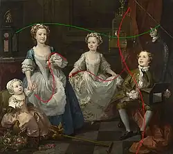 The French Rococo was at its height in the 1730s and its influence can be seen in the painting despite Hogarth not visiting France until 1743.[6] William Gaunt thought that Hogarth was more familiar with current French painting than he liked to admit.[7] The girl's aprons form serpentine S's, vertically in the oldest child, ending as it falls over her arm, and horizontally in the younger girl. A similar shape can be seen in the falling curtain on the right. The heads of the children and the cat create another noticeable S shape. The fruit bowl, a common subject in Rococo art, has been described as a "bravura piece of still-life painting" untypical of Hogarth's work.[2]