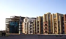 Buildings in the project had Manhattan-inspired names, including Tribeca House and Gramercy House.[3] The flagship nine-story building, known as Element House,[4] would include 73 units,[5] a 70,000 sq ft (6,500 m2) fitness center,[4] and a rooftop deck and lounge with views of the Las Vegas Strip and Red Rock Canyon.[6] The two other residential buildings, as well as the two office buildings, were four stories high.[7] The complex would ultimately consist of 12 buildings, and would include 150,000 sq ft (14,000 m2) of Class A office space, as well as 43,000 sq ft (4,000 m2) of ground-floor retail space. The project would feature approximately 30 retailers and four restaurants.[8]
