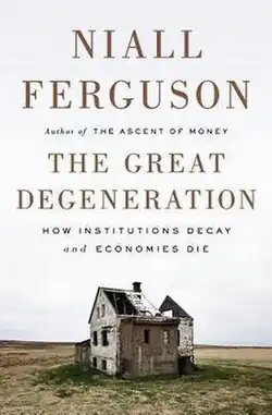 The Great Degeneration: How Institutions Decay and Economies Die is a 2013 book by the British historian Niall Ferguson, in which the author argues that following the conclusion of World War II, the economic and political supremacy of Western Europe and North America is fading rapidly. He believes that the West is in decline.[1] Ferguson describes an "institutional malaise" that is threatening 500 years of development in the West.[2] Financial Times reviewer Samuel Brittan said the book offers "an informative and enjoyable read."[3]