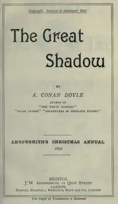 The Great Shadow, also known as The Great Shadow and other Napoleonic Tales, is an action and adventure novel written by Sir Arthur Conan Doyle. It was published in 1892 in J. W. Arrowsmith’s Bristol Library.[1] The novel takes place in the Napoleonic era on the Anglo-Scottish border city called West Inch. The Great Shadow refers to Napoleon’s influence and his reputation that forms a shadow over West Inch.