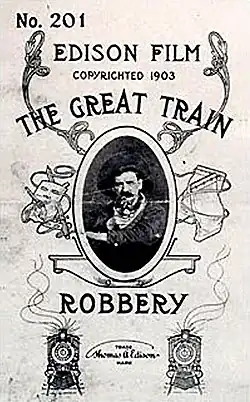 The Edison studio, facing growing competition from other American companies, welcomed Porter's ambitious plans.[6] His first major attempts at elaborate storytelling films included a 1902 adaptation of Jack and the Beanstalk in imitation of Méliès, and a 1903 Life of an American Fireman in the style of a notable Brighton School film, Fire![8] His films did well and were influential, bolstered by his status as the leading filmmaker at the most important American studio.[6] In October 1903 Porter joined forces with a new Edison hire, Max Aronson, who was a young stage actor billed as G. M. Anderson. Anderson's initial jobs for the studio were inventing sight gags and playing occasional roles, but he was soon working with Porter on creative collaborations.[9] Porter's next major film was The Great Train Robbery; Porter was in charge of production and photography, while Anderson may have assisted on staging.[10]