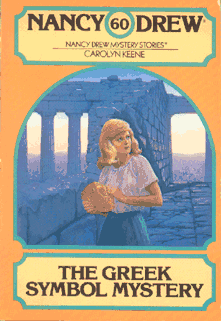 The Greek Symbol Mystery is the 60th volume in the Nancy Drew Mystery Stories series. It was originally published in paperback in 1981 by the Wanderer imprint of Simon & Schuster. The original edition had a cover and six interior illustrations by Ruth Sanderson. The cover art was later revised by Garin Baker in 1986 for the last Wanderer printing, and again by Linda Thomas in 1989 for the Minstrel printing.