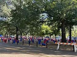 Described as "the Holy Grail of tailgating sites" by Sporting News,[4] The Grove comes to life for Ole Miss Rebels football home games with typically over 100,000 fans.[5] Fans arrive often around noon the day before the game (campus rule is no one allowed to "stake their claim" before 7:30 pm,[6] which is strictly enforced by campus police) to grab their spot in The Grove. This usually serene area of campus becomes a sea of red, white and blue tents. However, most of the tents are set up by professional tailgate vendors and not the students or families themselves.[7] Ole Miss students generally dress in their Sunday best: Men wear slacks, button-up shirts, bow ties, Sperry Top Siders, and coats while women wear cocktail dresses or brightly colored sundresses and high heel shoes. Some older fans also dress in this style.[1]