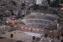 The Hashemite Plaza includes open spaces, fountains, gardens, parking lots and cafes. It is equipped with a centre that hosts cultural activities like the Amman Book Festival. The plaza is flanked by two of the most popular Roman ruins of Amman, the Roman theatre and the Odeon, while the Nymphaeum is just a short distance away. The Citadel Hill, which towers over the Plaza, offers good views of it.[1][2]