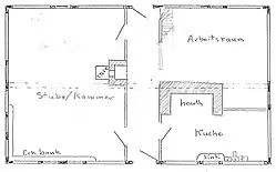 The log farmhouse's primary front door opens into a central hallway which is surrounded by a nonsymmetrical arrangement of interior rooms, including the Kueche (kitchen), Stube (stove room), and Arbeitsraum (work room).