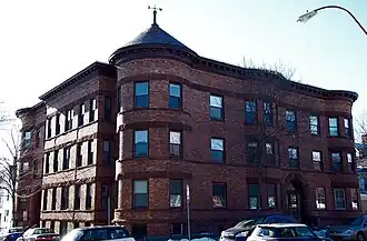 The Highland is set on the south side of Highland Avenue on Central Hill, directly opposite the city's high school. It is a three-story brick building, Richardsonian Romanesque in style, with brownstone trim, and a conical roof on its corner turret.[2] Brownstone beltcourses, varying in thickness, separate the basement, first, and second floors, and also separate the top of the third floor from the cornice, which has a band of dentil brickwork below the modillioned roof line. The main facade is six bays wide, divided into two similar sections having a rounded bay at the right. The main entrance is set in the third bay from the right beneath a large round brownstone arch.