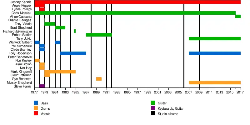 - Johnny Kannis (1977–84, 1989–92): Holmgren, Magnus. "Johnny Kannis". Australian Rock Database. Archived from the original on 3 March 2004. Retrieved 23 June 2017.