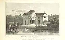 The Holme was the second villa to be built in Regent's Park, and the first of those to be designed or constructed by the Burton family. The house consists of two storeys above ground, as well as offices contained in a basement. The entrance is under an Ionic-style portico and pediments. It has a bow or rotunda decorated by four columns; the bow is surmounted by an attic, and is covered with a well-proportioned cupola.[5] Renovations occurred in 1911 with the addition of wings by Bertie Crewe and again in 1935 when a balustrade replaced an existing dome.[2]