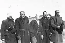 In Latvia, the Holocaust started on the night of 23 to 24 June 1941, when in the Grobiņa cemetery an SD detachment killed six local Jews, including the town pharmacist.[5] In the following days 35 Jews were exterminated in Durbe, Priekule and Asīte. On June 29 the Nazis started forming the first Latvian Auxiliary Police in Jelgava. Mārtiņš Vagulāns, member of the Pērkonkrusts organisation, was chosen to head it. In the summer of 1941, 300 men in the unit took part in the murder of about 2000 Jews in Jelgava and other places in Zemgale.[6] The killing was supervised by German SD officers Rudolf Batz and Alfred Becu, who involved the Einsatzgruppe in the action. The most important Jelgava synagogue was burned down through their joint effort. After the invasion of Riga, Walter Stahlecker, assisted by the members of Pērkonkrusts and other local collaborationists, organised the pogrom of Jews in the capital of Latvia. Viktors Arājs, aged 31 at the time, a possible former member of Pērkonkrusts and a member of a student fraternity, was appointed direct executor of the action. He was an idle eternal student who was supported by his wife, a rich shop owner, who was ten years older than he was. Arājs had worked in the Latvian Police for a certain period of time.[7] He stood out with his power-hungry and extreme thinking. The man was well fed, well dressed, and "with his student's hat proudly cocked on one ear".