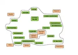 The Hundred Parishes is a cultural heritage initiative focused on an area in the East of England recognized for its high concentration of cultural and historical significance. Although without formal recognition or status, the concept has the blessing of county and district authorities. It encompasses around 450 square miles (1,100 square kilometres) of northwest Essex, northeast Hertfordshire and southern Cambridgeshire. The area comprises just over 100 administrative parishes, hence its name. It contains over 6,000 listed buildings and many conservation areas,[1][2][3][4] village greens, ancient hedgerows, protected features and a historical pattern of small rural settlements in close proximity to one another.