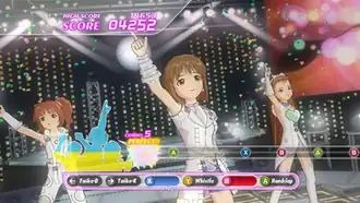 In the support mode, the idols begin their on stage performance and the player interacts by playing a rhythm minigame in either easy, medium or hard modes.[4] As the song plays, a predetermined sequence of controller button icons scroll from right to left towards a target icon and the player must press the correct button as the button icons pass over the target icon. The player is scored by the timing accuracy of these presses and is given one of four ratings: Perfect, Good, Normal and OK.[3] The player's performance is also represented by the voltage meter, which increases or decreases depending on if the player successfully hits a note or not. At intervals of 50 successful hits, the idol or idols will perform a special appeal to the audience which suddenly increases the voltage meter and the overall numerical score. In the hard mode, if the voltage meter goes down to zero, the performance will end prematurely; this does not occur in the easy and medium modes. The actions of the buttons as they relate to the performance change depending on the song and degree of difficulty. For example, a button may indicate anything from a cheer, handclap, whistle, musical instrument sound, or other various supportive sounds.[4]