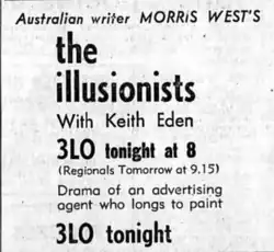 The Illusionists is a 1955 stage play by Morris West about an advertising agent who longs to paint. It was a verse drama, like his later play The Heretic. West had just sold his radio company and begun writing novels.[1]
