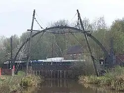 In 1997, a watercolour by Elias Martin was discovered in a Stockholm museum, which showed the bridge under construction in 1779.[28] The painting shows a moveable wooden scaffold consisting of derrick poles standing in the river bed being used as a crane to position the half-ribs of the bridge, which had been taken to the site by boat from Darby's foundry 500 metres (1,600 ft) downstream. Using the approach depicted in the painting, a half-size replica of the main section of the bridge was built in 2001 as part of the research for the BBC's Timewatch programme, which was shown the following year.[28][30]