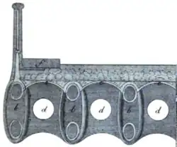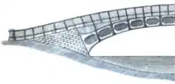 ...hollow pieces of cast iron in a longitudinal direction and plates or pipes of the same material, having sockets on them, to receive the ends or shoulders of the said pipes, tubes, or other hollow pieces, placed transversely; and extending from one side of the bridge to the other, so that when the required number of pipes, tubes, or other hollow pieces of cast-iron, and transverse places, or pieces, are put together they form the arch, and so firmly fix, connect, and unite, all the parts, as not to require the aid of screws, bolts, cramps, or any wrought-iron fastenings whatever; but, for the sake of giving the joins a more equal bearing, it will be proper to run lead or cement into them.[3]