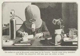 The Isolator was first introduced in the July 1925 edition of the American Physical Society magazine, with which Gernsback was affiliated.[1][3] The helmet was first created using wood and felt.[4] The mouth of the helmet had a baffle for breathing and had three pieces of glass so that users could see outside.[5] It was deemed successful, but Gernsback had estimated that it was only "75%" efficient and said it did not keep out all sounds.[6] Gernsback re-designed the device without wood and cut white lines into the glass so users could see out of the helmet. Gernsback said that the new design was 90-95% efficient and kept out almost all sounds.[6][7] However, Gernsback also noted that the helmet could only be worn for about 15 minutes at a time as the user would become drowsy.[8][9] Gernsback then added an oxygen tank to assist the user with breathing while wearing the helmet.[6][10]