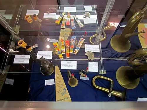 The museum's collection is made up of nearly 200 kazoo-related items,[3] making it one of the world's largest private kazoo collections.[1] All items are kept in glass cases in a dedicated building at the Kazoobie Kazoos factory.[1] Kazoos in the collection include one used in the television program The Partridge Family, kazoos shaped like famous cartoon characters, electric kazoos[6] and kazoos that are over 100 years old. In addition, the museum features an old press used to make kazoo parts, kazoo music sheets and various pieces of memorabilia.[3]