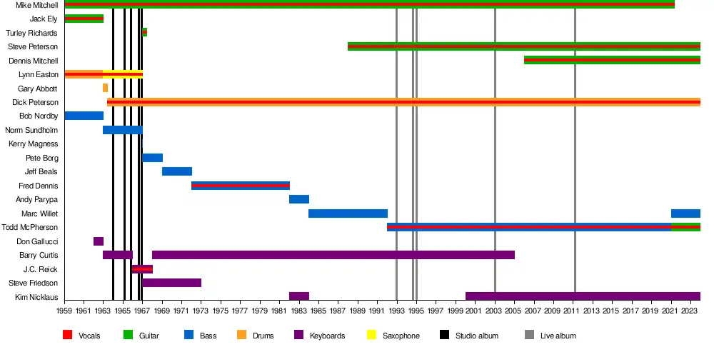 The two remaining original Kingsmen, Lynn Easton and Mike Mitchell, were joined by Gary Abbott, Barry Curtis and Norm Sundholm to record their first album and tour as the official band. Dick Peterson (not Dickie Peterson) replaced Gary Abbott shortly thereafter. This line-up stayed intact from 1964 into 1966 and charted multiple singles and albums with Easton as the principal vocalist.
