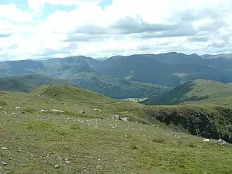 The summit is grassy with a small cairn and a ridgeline wall passes within a few yards. The view west is good with all of the 3,000 ft tops in sight. Ullswater can also be seen and Hayeswater and Brothers Water can be brought into view by moving a little to the south west.[1]