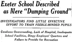 The school was criticized for overcrowding and inadequate care.[4] It was described as a "dumping ground" and said that officials there had a "fatalistic attitude" with little effort being made toward deinstitutionalization.[5] During the middle of the first half of the 20th century, the Exeter School did little to educate or train its growing population. To alleviate overcrowding, the school building was used mainly as living quarters for young children and wayward girls, while the dormitories were filled well beyond capacity. Adopting a purpose more characteristic of a custodial or penal institution, the Exeter School's policy became focused primarily on detaining people indefinitely as a means of segregating them from free society. This burgeoning practice was enacted upon individuals who committed petty crimes, or, in many cases, no crimes at all, especially toward women accused of immoral practices such as prostitution, sodomy, extramarital intercourse, and "illegitimate" pregnancy. A court commitment to Exeter was leveraged in countless cases as a means of eliminating the bloodline of entire families. Because compulsory sterilization was illegal in Rhode Island, most women sentenced under such pretenses were confined to Exeter until menopause or natural death, while a select few were sterilized nevertheless by willing surgeons who found ways to circumvent the law. In this way, until the end of World War II, the Exeter School's foremost function was that of a eugenics-era segregation facility.[6]