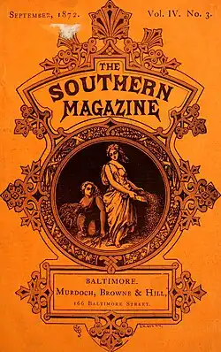 Although Hill himself was no advocate of women's rights and legal reform in that area, the magazine featured the works of many women, including Preston (aforementioned), Mary Bayard Clarke, and Fanny Murdaugh Downing.[8] Issues would commonly include four to five works by women authors (who would, like the male authors, usually be named in the table of contents next to their works), reviews of books by women writers (e.g. Emily V. Mason's Southern Poems of the War) or in favor of women's rights (e.g. Virginia Penny's The Employments of Women reviewed in 1868), and advertisements for women's schools.[8] For white women the magazine was one of many post-bellum magazines that were willing to accept their works.[9]