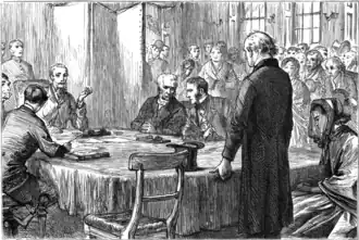 Other than its written form, The Last Chronicles of Barset has also been transformed into visual illustrations. The visual illustration was designed by George Housman Thomas and was published in 1867 alongside the novel. Titled The Last Chronicle of Barset With Illustrations, the black and white copy features certain events from the novel.[18] For certain illustrations, Thomas had drawn inspiration from John Everett Millais, a Victorian illustrator.[13] Millias had provided multiple illustrations of The Crawley Family in Trollope's fourth novel in the series, Framley Parsonage. Gordon Ray states that these illustrations serve to vividly complement the novel as they provide an understanding of Trollope's intentions with each character.[19] While Trollope did not draw the illustrations himself, Ray stated that each sketch was tailored to Trollope's own personal desire as Trollope believed that "the author can select the subjects better than the artist - having all the feelings of the story at his fingers' end."[19]