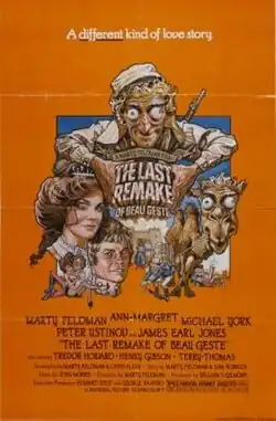 The Last Remake of Beau Geste is a 1977 British historical comedy film[3] directed by, co-written by and starring Marty Feldman. It is a satire loosely based on the 1924 novel Beau Geste, a frequently filmed story of brothers and their adventures in the French Foreign Legion. The humor is based heavily upon wordplay and absurdity. Feldman plays Digby Geste, the awkward and clumsy "identical twin" brother of Michael York's Beau, the dignified, aristocratic swashbuckler.