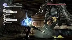 Developing the gameplay began at the start of development, with a test environment being built to develop and refine the basics of the battle system. Work within the test build spanned approximately one and a half years. While creating the battle system, the staff decided that the key words should be "order" and "chaos": whoever gained order on the battlefield would be the victor. One of the concepts that emerged from this was Gathering, Zael's ability to direct all enemies' attention towards him. At first, Gathering ended up generating an unwanted amount of chaos on the battlefield, and this resulted in the trial-and-error period for it running on for a long time. The biggest challenge, once the concept had been finalized, was adjusting its effectiveness on the battlefield depending on the situation and enemy types.[13] A concept that did not make it into the final game was "Replay": after an enemy successfully cast a spell, players could rewatch the last few seconds of battle from an overhead view to see what type it was and take that into their strategy. This slowed the pace of combat down too much, so the concept was entirely removed. Hangovers of it include the ability to freeze time during certain actions, and the overhead perspective when commanding party members.[13][14] The cover system was designed around the limitations of the camera control born from the Wii Remote's control scheme.[25]