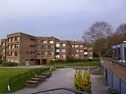 In 1961, Isi Metzstein and Andrew MacMillan of Glasgow-based firm Gillespie, Kidd and Coia were appointed to design accommodation for a further 1,000 students at The Lawns. They designed a series of twelve halls, each comprising five blocks identified by the letters A to E, and accommodating approximately 140 residents. A typical block configuration was three floors, with each floor accommodating nine students in seven rooms. The scheme was constructed between 1962 and 1968, when six of the projected twelve blocks were complete.[3] In that year, The Lawns was awarded a RIBA Bronze Regional Award.[4] In 1993, the six contemporary halls were designated as Grade II* listed buildings and are recorded in the National Heritage List for England, maintained by Historic England.[5][6][7][8][9][10]