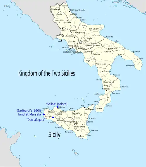 - Giuseppe Garibaldi, the military leader of the Expedition of the Thousand (11 May to 1 October 1860) from Marsala in Sicily to northern Lazio (Campania)