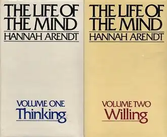 The Life of the Mind was the final work of Hannah Arendt (1906–1975), and was unfinished at the time of her death. Designed to be in three parts, only the first two had been completed and the first page of the third part was in her typewriter the evening of the day she suddenly died. The unfinished work was edited by her friend, author Mary McCarthy, and published in two volumes in 1977 and 1978.