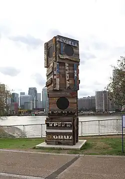 A 5.5m tall totemic sculpture made of 1.4m cubes of reclaimed wood, including timber from Ghanaian fishing boats, and an embedded sound installation.[28] |