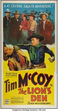 The Lion's Den is a 1936 American western film directed by Sam Newfield and starring Tim McCoy, Joan Woodbury and Don Barclay.[1]