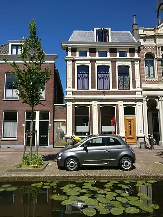 In 2015, archival research based on the city's quay dues register, which gives detailed measurements of all houses and passageways along the canals of Delft at the time, has resulted in the conclusion that the site is Vlamingstraat, a street with a narrow canal, at the present-day numbers 40 and 42.[8] The research also found that the property on the right in the painting belonged to Vermeer’s aunt, Ariaentgen Claes van der Minne. She had a business selling tripe, and the passageway beside the house was known as the Penspoort, or Tripe Gate. Vermeer’s mother and sister also lived on the same canal, diagonally opposite.[8][9] Further research showed that the buildings and tree behind the house as seen on the painting match with period correct maps of the location. Also the location of the outlet sewer of the 'tripe' gutter running from the left doorway to the canal is correct in this present day.[10]