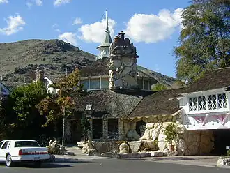 The property is adorned with a pseudo–Swiss Alps exterior and lavish common rooms accented by pink roses, Western murals, and hammered copper. The predominant exterior color is pink, which extends to the lamp posts and trash cans.[3] Each of the 110 guest rooms and suites is uniquely designed and themed, though some tourists stop just to peek at the famous rock waterfall urinal located in the men's restroom,[1][4] a feature designed by Hollywood set designer Harvey Allen Warren.