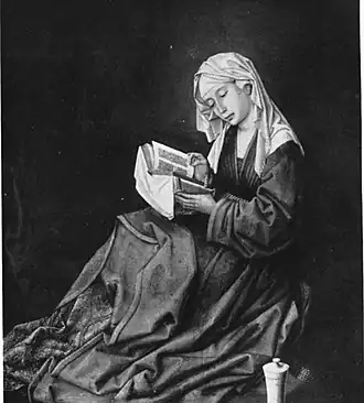 By the medieval period, reading became synonymous with devotion, which involved withdrawal from public view. Van der Weyden's placement of the Magdalen in an interior scene reflects the increasing literacy of domestic or laywomen in the mid-15th century. The increased production of devotional texts showed that noble women of the period routinely read texts such as a psalter or book of hours in the privacy of their homes.[37] Whether the Magdalen herself was a reader, by the 17th century she was firmly established as such in the visual arts. Because the Magdalen was present at Christ's death and subsequent resurrection, she was seen as the bearer of news—a witness—and hence directly associated with the text.[38]
