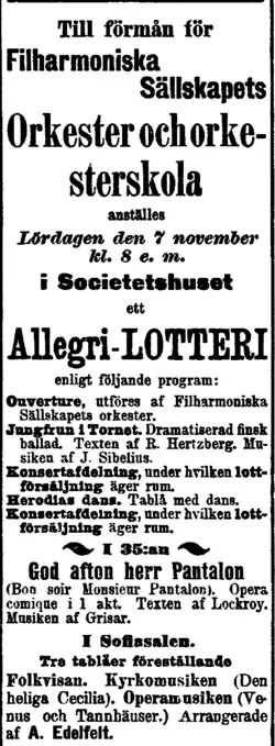 - "Lotteriet till förmån for Filharmoniska sällskapet" [The lottery in favor of the Philharmonic Society]. Hufvudstadsbladet (in Swedish). No. 305. 8 November 1896. p. 5.