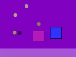 The player interacts using only mouse movement, hovering over abstract shapes. The player's actions or inaction enlarge or shrink pink and blue squares, increase or decrease their opacity, and move them towards or away from each other.[2][3] Placing the cursor over either of the squares causes the blue square to shrink, and for the squares to move towards each other. Moving the cursor over a circle makes the circle disappear, while at the same time reducing the size of the pink square. If the two squares "kiss" by touching edges, the sizes and transparency are affected inversely: the blue square shrinks and becomes more transparent; the pink square grows and becomes more opaque. When the blue square comes in contact with circles of any color other than black, it grows and becomes more opaque. When the pink square comes in contact with circles of any color other than black, it grows but transparency does not change. When either square collides with a black circle, its size decreases. As squares collide with each other or with circles, a light bar at the bottom of the screen grows in size. Over time, the pink square steadily increases its transparency unless counteracted by touching edges with the blue square.[2][4]