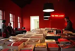 The Marx Lounge is an art exhibition by the Chilean artist Alfredo Jaar.[1][2] It was first presented at the Liverpool Biennial art exhibition in England in 2010 and was later shown at the Biennial again in 2016.[3][4][5] The exhibit has subsequently been presented at the Stedelijk Museum Amsterdam's SMBA space and the Andalusian Center for Contemporary Art (CAAC).[6][7][8] For the exhibition a large space was transformed into a red reading room with sofas, reading lamps and a large reading table on which a large collection of books was installed.[9]