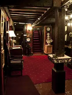 The Mermaid Inn is well known for its hauntings and has been subject to an investigation by Most Haunted. The events in one room have been described as "one of the most well-organised ghostly scenarios anywhere".[18] Room 16 (Elizabethan) was said to be the scene of a duel involving two men "of unknown date and origin"[18] (although they have also been described as wearing "16th-century clothing").[5] After fighting through some of the nearby rooms, one of the men was killed, dragged into the adjacent room and thrown through a trapdoor into the dungeon below.[5][18] Many unexplained light anomalies have been recorded in the middle of the night. On one occasion an employee was tending to the fireplace when all of the bottles on the bottle shelf at the other end of the room fell off; the experience caused him to resign.[19] The ghost of a maid is said to be present in the inn; she was the girlfriend of one of the smugglers of the Hawkhurst Gang and was killed by his fellow gang members as they feared she knew too much and would expose them.