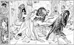 The prince left for war with the king, and when the king discovered he had not brought his sword, he promised his entourage that whoever brought his sword back to him would have the hand of the princess and would inherit the throne. The young prince and other knights took off for the city to retrieve the sword, The prince got ahead by frightening off the other knights by transforming himself into a lion.