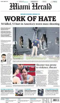 ![]() The June 13, 2016 front page of the Miami Herald, with the headline story reporting on the nightclub shooting in Orlando, Florida | |