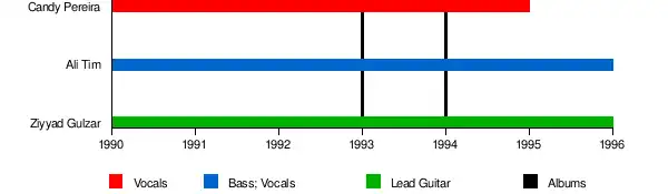 From 1993 till 1995, the band underwent numerous line up changes at different stages, picking session musicians and permanent back up musicians on keyboards and drums but the trio, Ali, Ziyyad and Candy, remained throughout until their eventual break-up in 1996.[2]