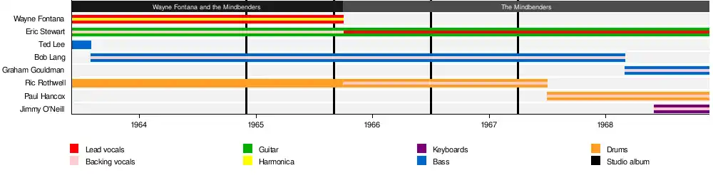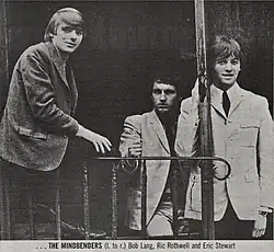 ![]() Wayne Fontana & the Mindbenders in 1965. L-R: Bob Lang, Ric Rothwell, Eric Stewart and Wayne Fontana. | |