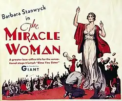 The Miracle Woman is a 1931 American pre-Code drama film directed by Frank Capra and starring Barbara Stanwyck, David Manners, and Sam Hardy. Based on the play Bless You Sister by John Meehan and Robert Riskin, the film is about a clergyman's daughter who becomes disillusioned by the mistreatment of her dying father by his church. Having grown cynical about religion, she teams up with a con man and performs fake miracles for profit. The love and trust of a blind veteran, however, restores her faith in God and her fellow man. The Miracle Woman was the second of five film collaborations between Capra and Stanwyck. Produced and distributed by Columbia Pictures, the film was reportedly inspired by the life of Aimee Semple McPherson.[1]