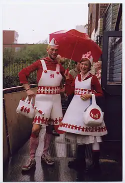 One Solidarity Sister explains: "We have appeared in these costumes a couple of times in Nottingham and in Sheffield. We dress in little white dresses, with one of us in lederhosen and hats and bags. It's about showing solidarity. It's more a sort of universal image. On the bands and the skirts there's lots of images of people holding hands. It's about spreading equality, friendship and acceptance. We look a little bit like aid nurses. Like it's about having a helping hand. Being there to support people. The dresses were made from reclaimed fabrics. They were used for car seat padding. It's good to be reusing stuff."[18]
