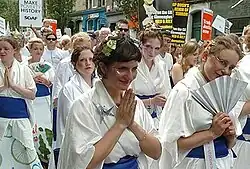 During the spring of 2005, various kimono-making workshops asked people to "join the geisha of gaiety on a passionate mission of peace and progression, when 8 men think to meet undisturbed, unruffled and untroubled to decide upon the worlds future".[2] A "Geisha Bloc" took part in the Make Poverty History march in Edinburgh on 2 July, and others took their costumes to the camp in Stirling for direct action planned to disturb the summit.