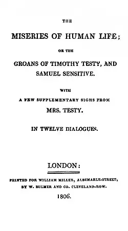 The Miseries of Human Life was written by James Beresford and published in 1806, first as a single volume and then as an expanded two-volume edition later that year. Illustrated by George Cruikshank, it catalogued "in excruciating detail" the "petty outrages, minor humiliations, and tiny discomforts that make up everyday human existence". The Miseries were written as a series of dialogues between Mr Samuel Sensitive and Mr Timothy Testy, in which they catalogue the daily "injuries, insults, disappointments and treacheries" of everyday life. Mrs Testy makes occasional appearances to offer "Supplementary Sighs" from a feminine perspective.[1]
