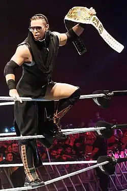 During this time, he gained a new entrance theme "I Came to Play", performed by the band Downstait. The Miz soon began a rivalry with MVP that began with a critically well-received verbal exchange between the two.[92] The two met in an unadvertised match for the United States Championship at the Royal Rumble on January 31, 2010, with the Miz retaining his title, but in the Royal Rumble match itself MVP eliminated both himself and the Miz.[93] Also around this time, the Miz formed a tag team with Big Show — later dubbed "ShoMiz" — and on the February 8 episode of Raw the two defeated D-Generation X (DX) (Shawn Michaels and Triple H) and The Straight Edge Society (CM Punk and Luke Gallows) to become the Unified Tag Team Champions, making the Miz the first wrestler in WWE history to hold three championships at the same time (United States, World Tag Team and WWE Tag Team Championships).[94] At Elimination Chamber on February 21, the Miz again successfully defended his United States Championship against MVP after interference from Big Show, ending their feud.[95] At WrestleMania XXVI on March 28, ShoMiz defeated John Morrison and R-Truth to retain the title again.[96] At Extreme Rules on April 25, ShoMiz took part in a tag team gauntlet match, and made it to the final two teams, but were eliminated by The Hart Dynasty (David Hart Smith and Tyson Kidd). The next night on Raw, ShoMiz lost the Unified Tag Team Championship to The Hart Dynasty, resulting in Big Show turning face by attacking the Miz after the match, bringing an end to the team.[97]
